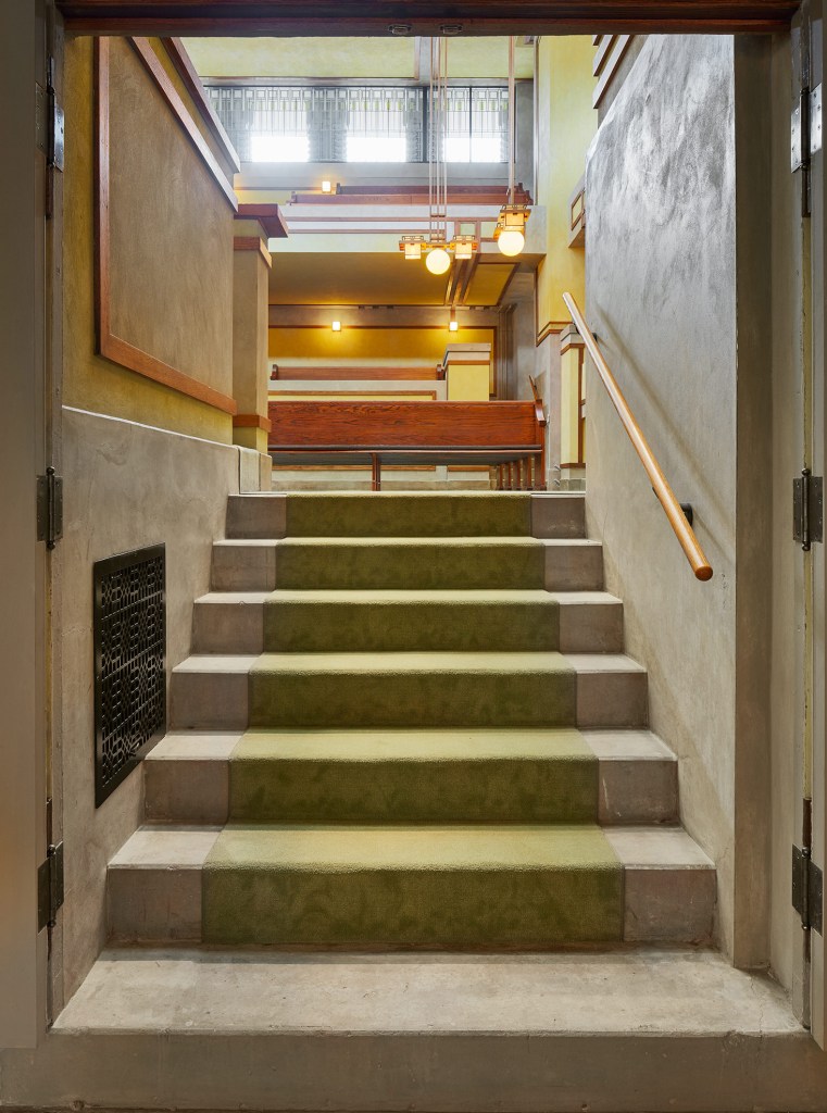 Unity Temple’s acoustics are known for their clarity and balance. The low ceiling helps to enhance the overall quality of sound, allowing anyone to be clearly heard and understood throughout the space. The use of hard surfaces, such as concrete, stone, and wood also contribute to the warmth and richness of the sound.
